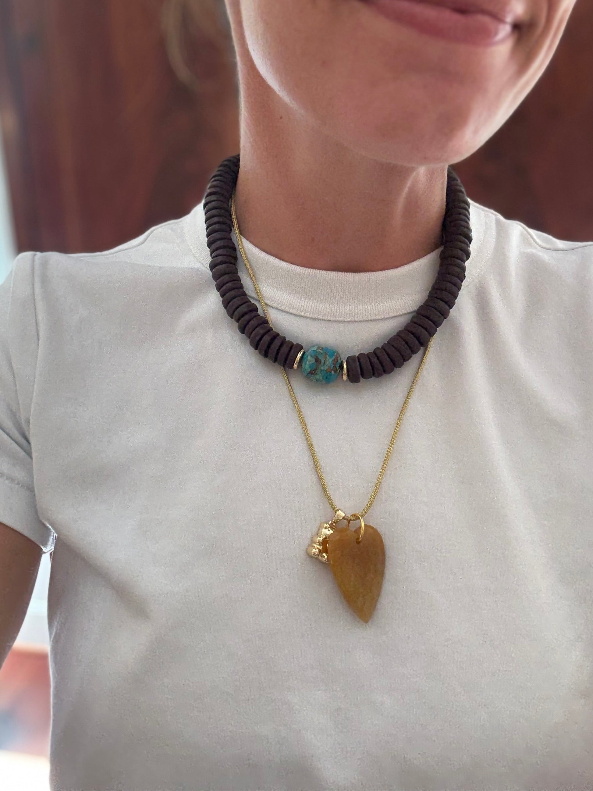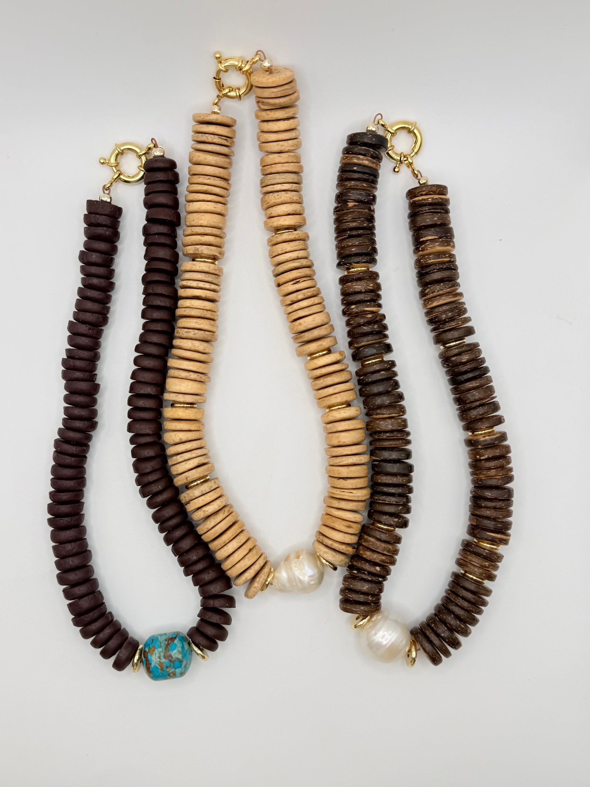 To keep your necklaces looking their best, take them off before sleeping, showering, or getting into contact with sweat, saltwater, or chemicals like chlorine, perfume, makeup, or lotions.