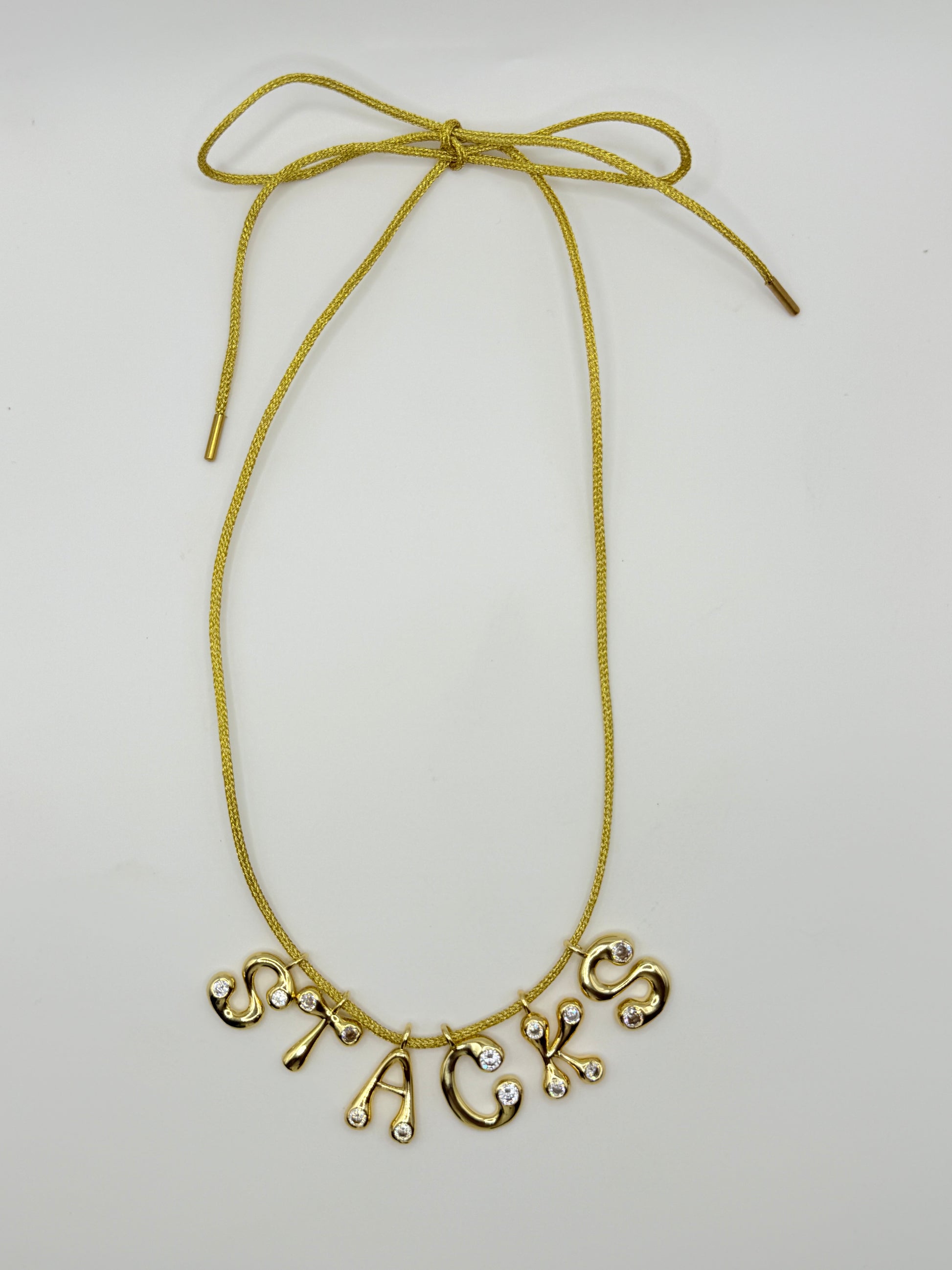 34" lurex cord, perfect for layering charms! Adjustable tie for versatile styling.