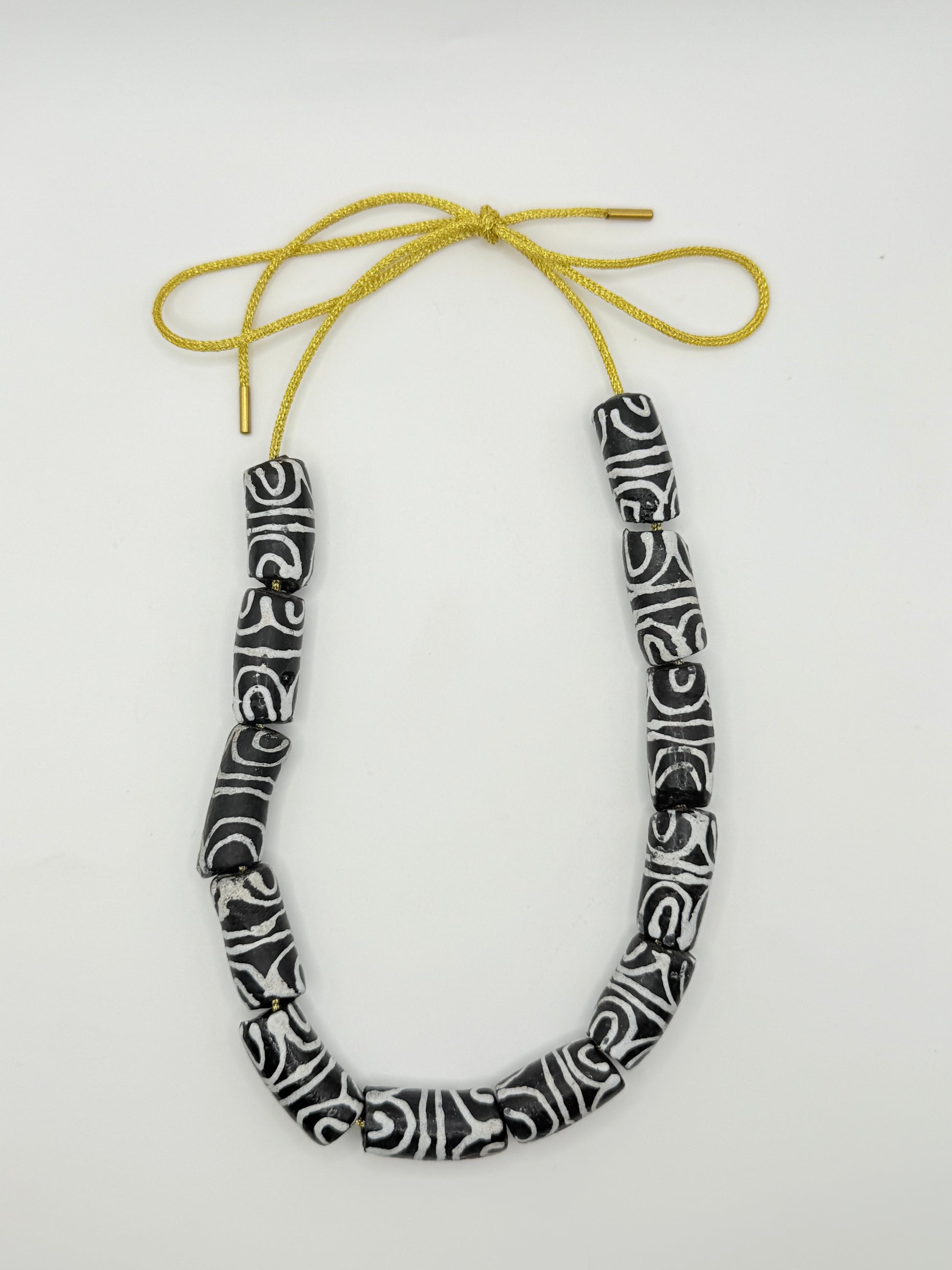 Black and white patterned beads on a 34" lurex cord. Designed to tie and style to your perfect length.