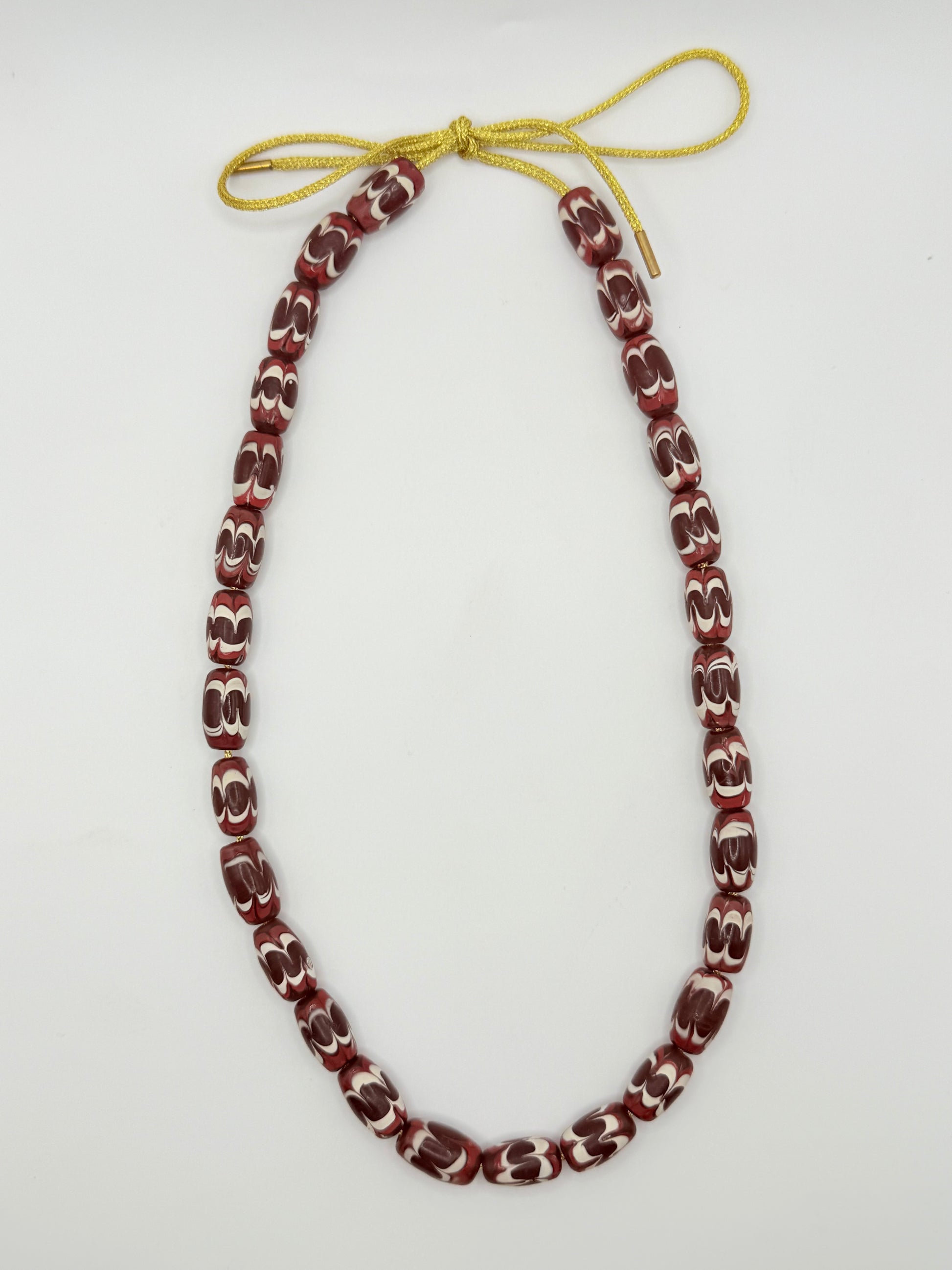 Brown and white patterned beads strung on a 34" lurex cord. Adjustable tie closure lets you wear it at any length.