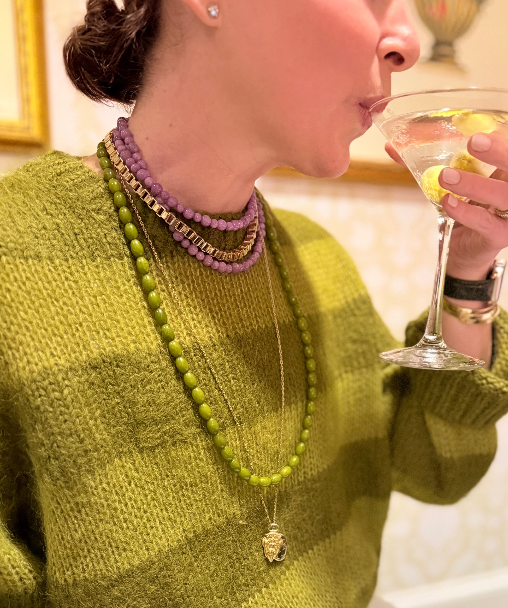 To keep your necklaces looking their best, take them off before sleeping, showering, or getting into contact with sweat, saltwater, or chemicals like chlorine, perfume, makeup, or lotions.